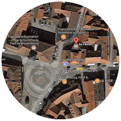 Das historische Gästehaus “Au Faucon“ ("Zum Falken") im elsässischen Fachwerk-Stil stammt aus dem Jahr 1535 und liegt zentral in der Stadtmitte von Wissembourg in einer ruhigen Seitenstraße. Restaurants, Bistros, gemütliche Cafés und charmante Einzelhandelsgeschäfte sind problemlos und in wenigen Minuten zu Fuß erreichbar. Parkplätze befinden sich nur wenige Meter vom Gästehaus "Au Faucon" entfernt.
